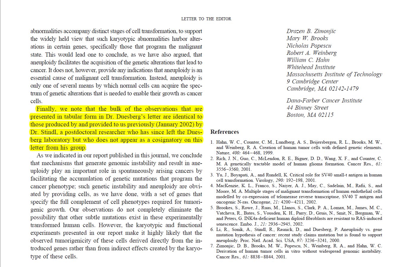 Peter Duesberg (University of California at Berkeley) challenged these experiments (3, 4). As a visiting scholar in his lab, I found that 100% of the supposedly diploid tumour cells (HA1ER-2, HA1ER-3) contained unbalanced chromosome aberrations (5, 6). Identical chromosomal rearrangements were present in a large fraction (up to 89%) of the cells, which cannot be explained by the “outgrow of aneuploid variants” (5, 6) - after just 1 week in cell culture. My letter to Cancer Research was rejected in 2002. Since then, I am convinced that unbalanced chromosomal aberrations play an essential role in the causation of epithelial cancer (=carcinoma). The paper 'Defining the steps that lead to cancer: ...' has been published in 2008.